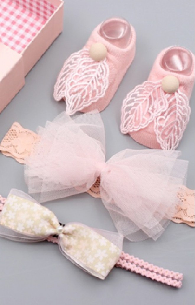 เซ็ตถุงเท้าเด็กมาพร้อมสายคาดผมเซ็ต 3 ชิ้น โทนสีชมพู ถุงเท้าแต่งใบไม้ สายคาดผมโบว์ 2 แบบ ถุงเท้าแบบข้อสั้น มีกันลื่น มาในกล่องสวยงาม เหมาะซื้อเตรียมไว้ให้ลูกสาวหรือซื้อรับขวัญหลานสาว รับรองต้องถูกใจทั้งคนรับและคนให้ขนาด: