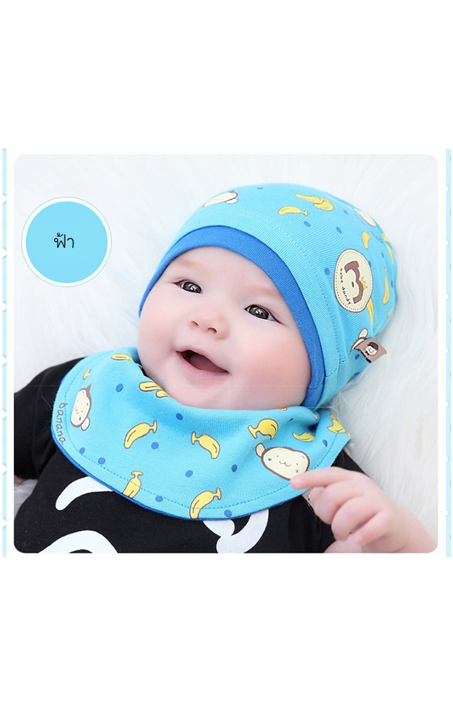 เซ็ตหมวกเด็กลายลายลิงและกล้วยมาพร้อมผ้ากันเปื้อนแบบโค้ง