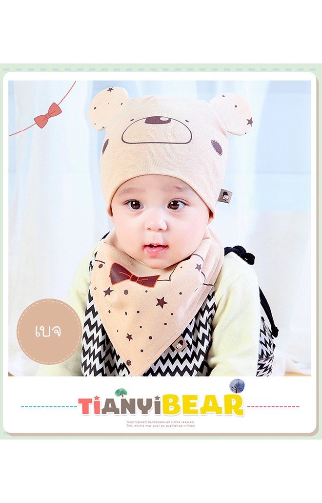 เซ็ตหมวกเด็กอ่อนลายหมีน้อยมาพร้อมผ้ากันเปื้อนสามเหลี่ยม TIANYIBEAR