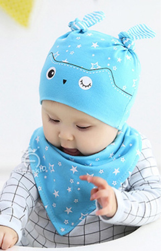 เซ็ตหมวกเด็กเล็กมาพร้อมผ้ากันเปื้อนลายนกฮูก สกรีนรูปดาว