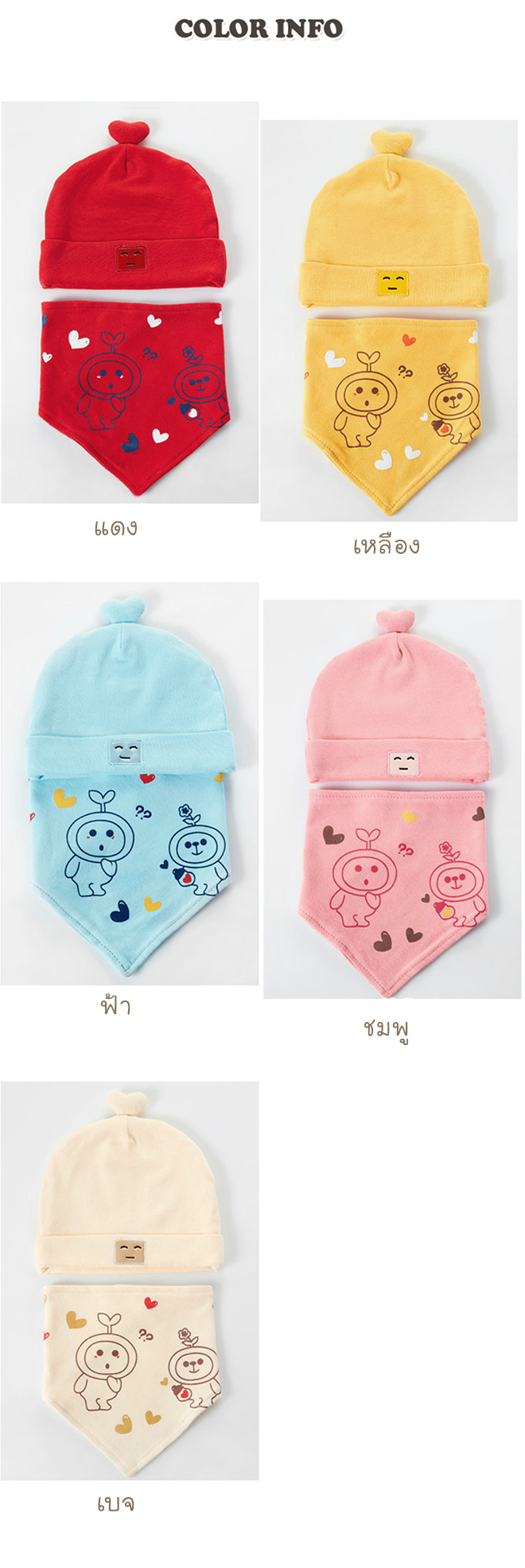เซ็ตหมวกเด็กเล็กพร้อมผ้ากันเปื้อนลายหุ่นยนต์ลายเข้าชุดกัน เซ็ตเด็กอ่อนคอลเลคชั่น 2017 จาก GZMM ใส่น่ารักทั้งเด็กชายและเด็กหญิง มีให้เลือก 5 สี แดง เหลือง ฟ้า ชมพู และ เบจขนาด: