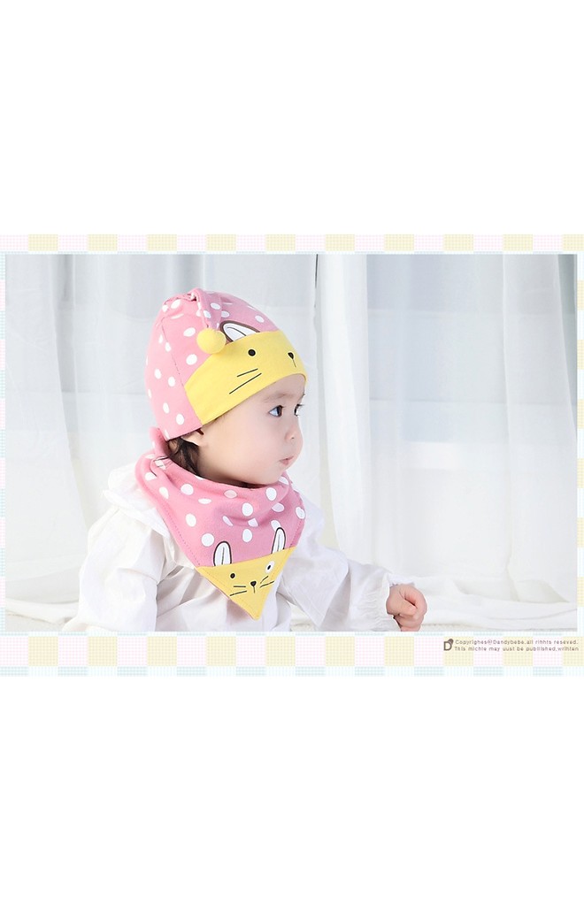 เซ็ตหมวกเด็กเล็กยอดแหลมลายจุดหน้าแมวเหมียวมาพร้อมผ้ากันเปื้อน